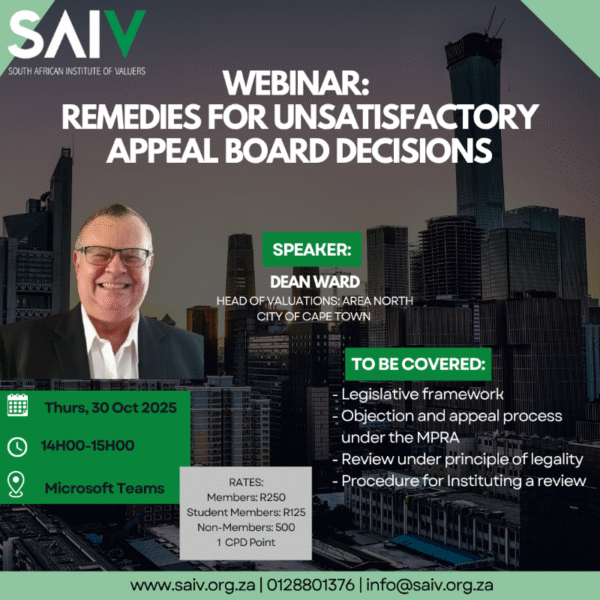 Excellent webinar, well run & a great idea to assist valuers to get CPD points. It’s great to be able to see / watch talks from all over SA.